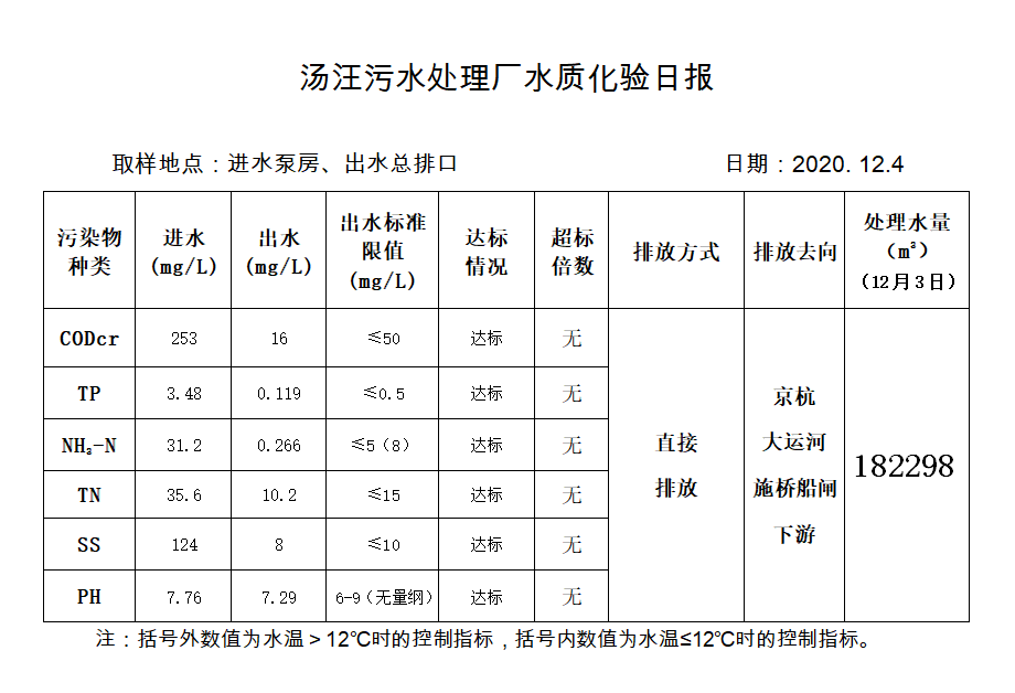 汤汪污水处理厂水质化验日报(2020.12.4)