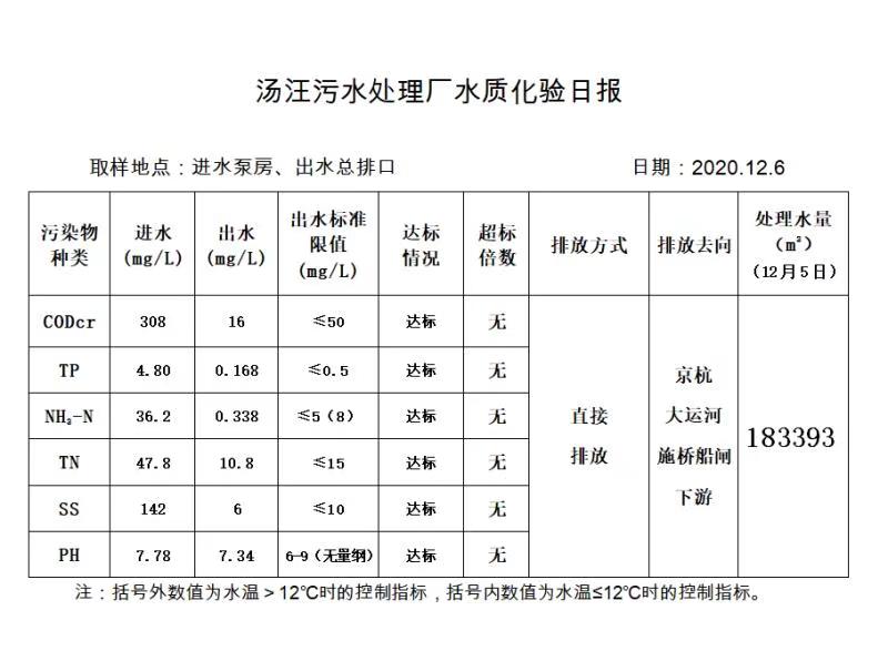 汤汪污水处理厂水质化验日报(2020.12.6)