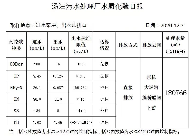 汤汪污水处理厂水质化验日报(2020.12.7)