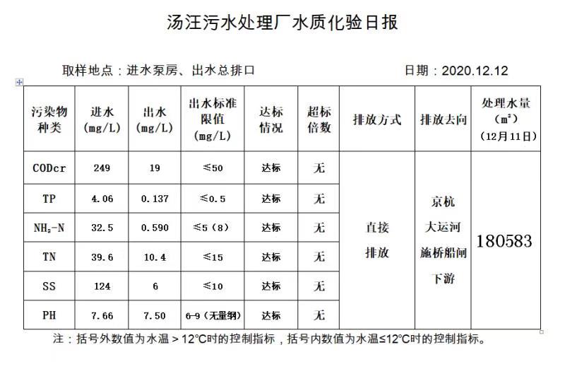 汤汪污水处理厂水质化验日报(2020.12.12)