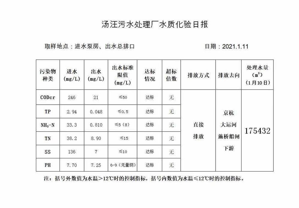 汤汪污水处理厂水质化验日报(2021.1.11)