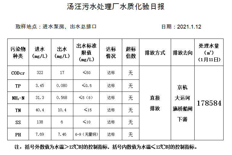 汤汪污水处理厂水质化验日报(2021.1.12)