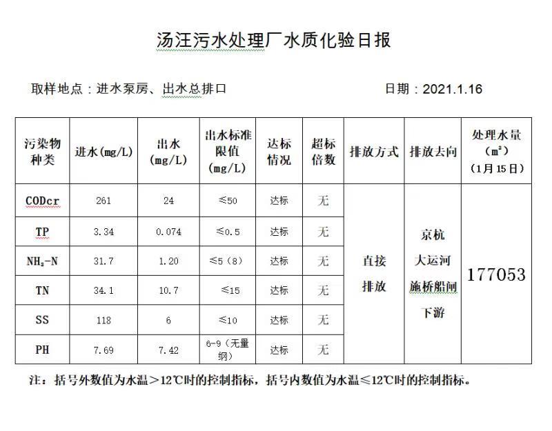 汤汪污水处理厂水质化验日报(2021.1.16)