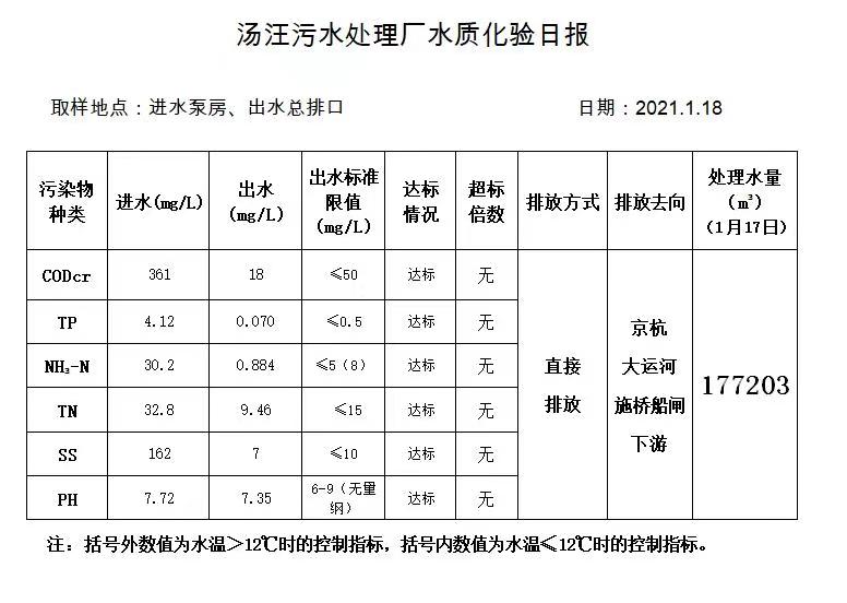 汤汪污水处理厂水质化验日报(2021.1.18)