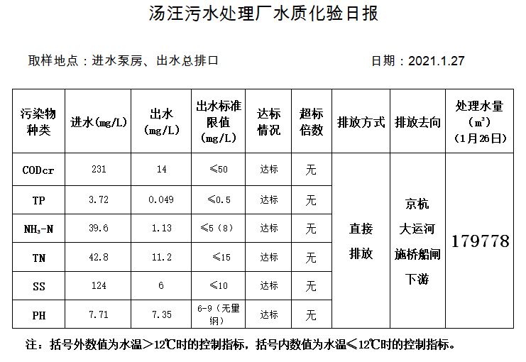 汤汪污水处理厂水质化验日报(2021.1.27)