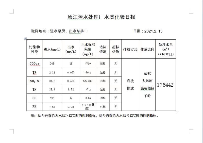 汤汪污水处理厂水质化验日报(2021.2.13)