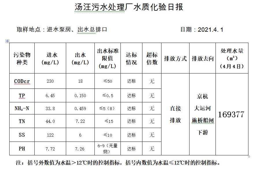 汤汪污水处理厂水质化验日报(2021.4.1)