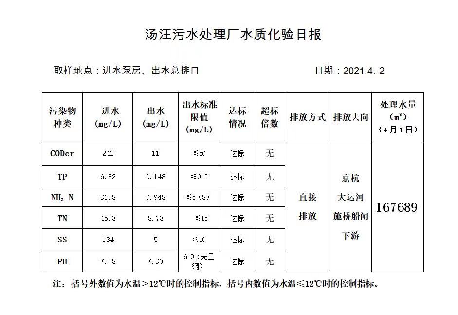 汤汪污水处理厂水质化验日报(2021.4.2)