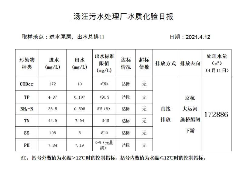 汤汪污水处理厂水质化验日报(2021.4.12)
