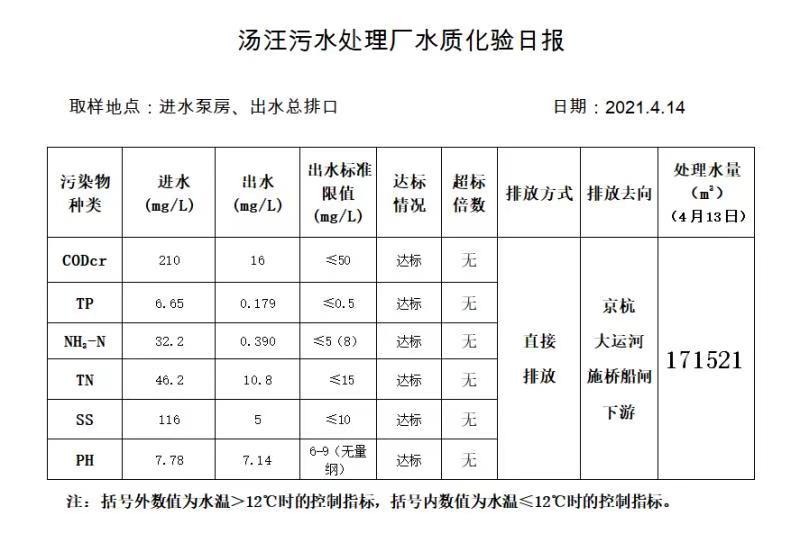 汤汪污水处理厂水质化验日报(2021.4.14)