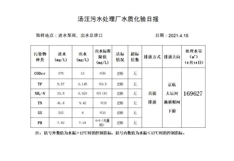 汤汪污水处理厂水质化验日报(2021.4.15)