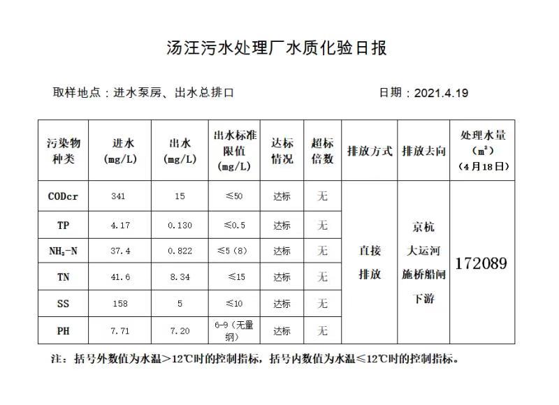 汤汪污水处理厂水质化验日报(2021.4.19)