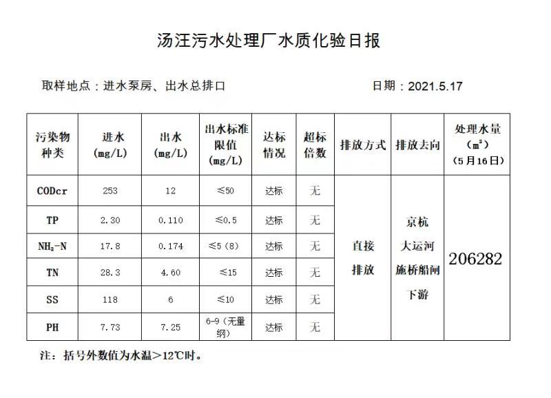 汤汪污水处理厂水质化验日报(2021.5.17)