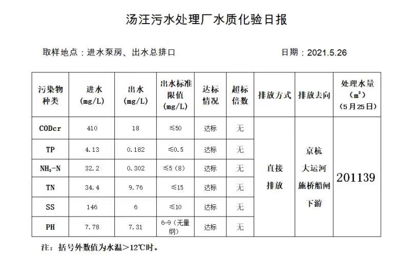 汤汪污水处理厂水质化验日报(2021.5.26)