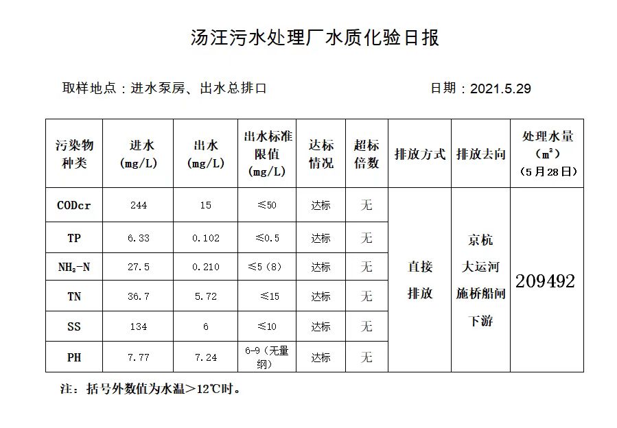 汤汪污水处理厂水质化验日报(2021.5.29)