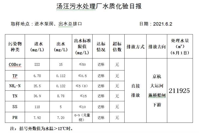汤汪污水处理厂水质化验日报(2021.6.2)