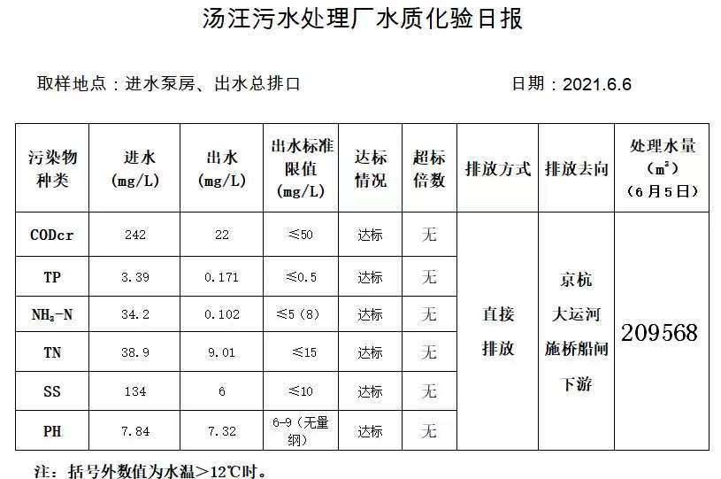 汤汪污水处理厂水质化验日报(2021.6.6)