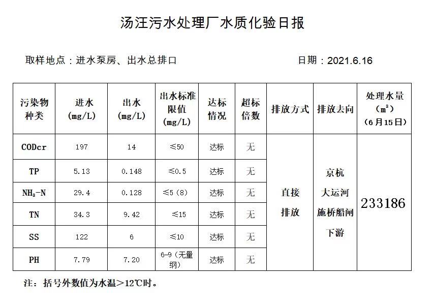 汤汪污水处理厂水质化验日报(2021.6.16)