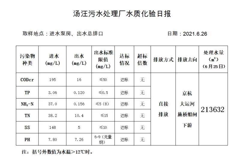汤汪污水处理厂水质化验日报(2021.6.26)