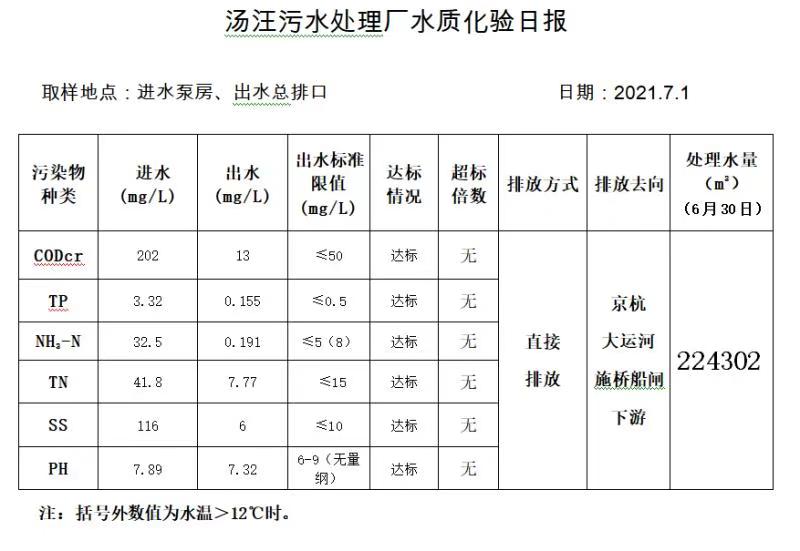 汤汪污水处理厂水质化验日报(2021.7.1)