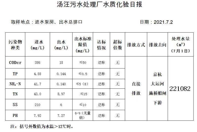 汤汪污水处理厂水质化验日报(2021.7.2)