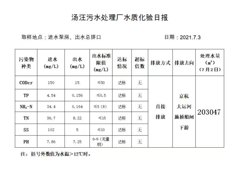 汤汪污水处理厂水质化验日报(2021.7.3)