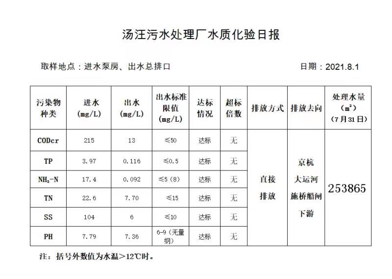 汤汪污水处理厂水质化验日报(2021.8.1)