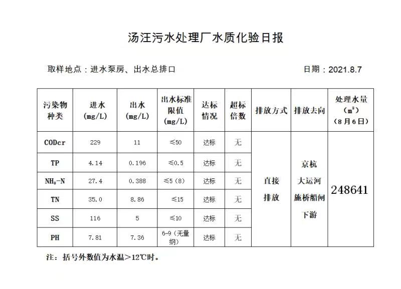 汤汪污水处理厂水质化验日报(2021.8.7)