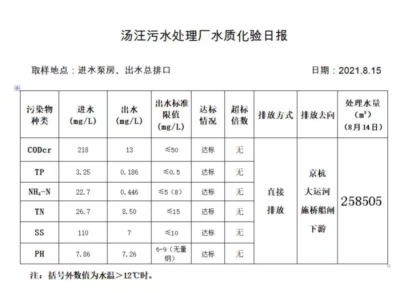 汤汪污水处理厂水质化验日报(2021.8.15)