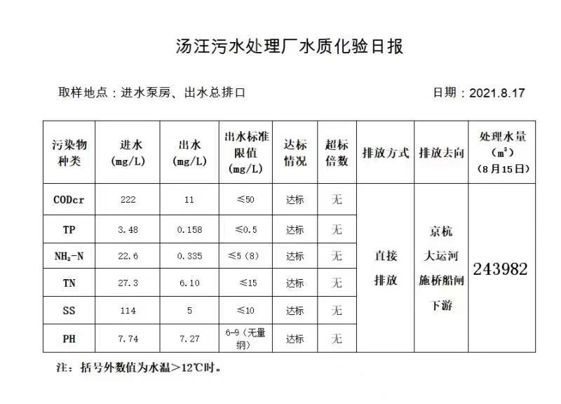 汤汪污水处理厂水质化验日报(2021.8.17)