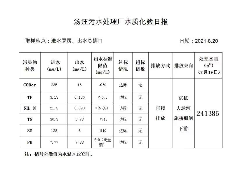 汤汪污水处理厂水质化验日报(2021.8.20)