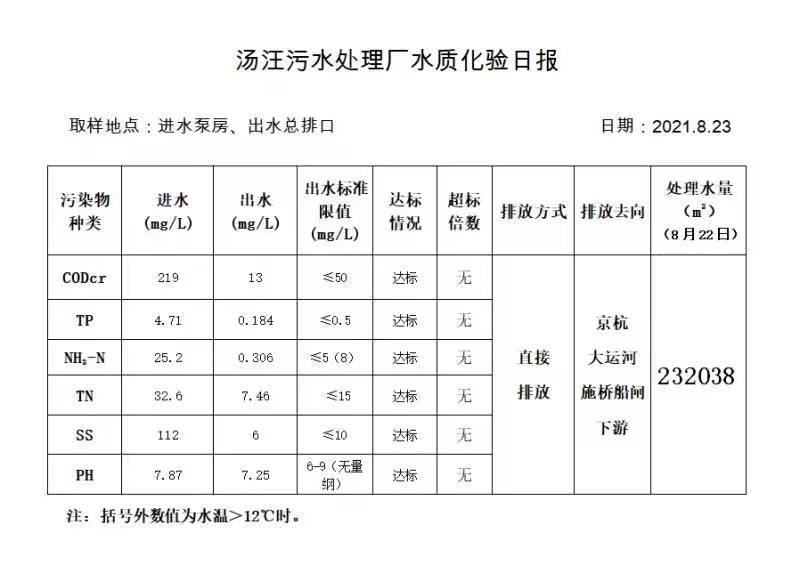 汤汪污水处理厂水质化验日报(2021.8.23)