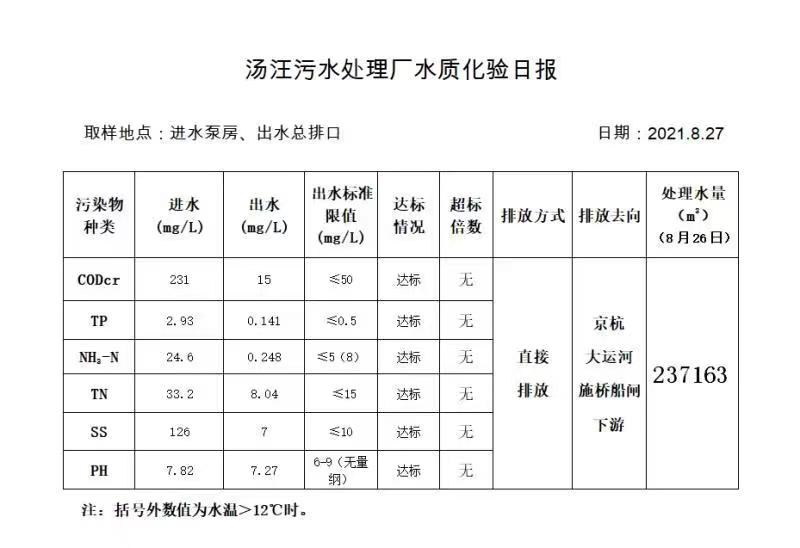 汤汪污水处理厂水质化验日报(2021.8.27)