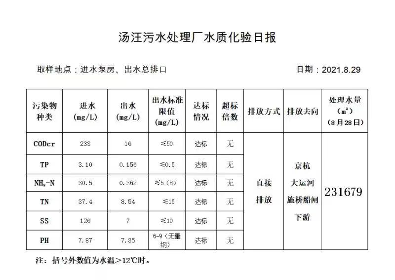 汤汪污水处理厂水质化验日报(2021.8.29)