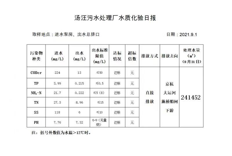 汤汪污水处理厂水质化验日报(2021.9.1)