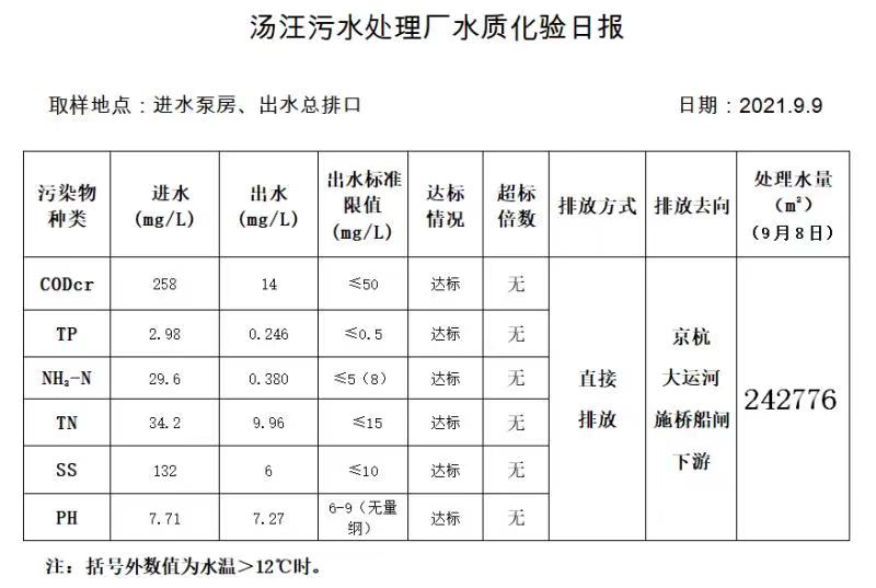 汤汪污水处理厂水质化验日报(2021.9.9)