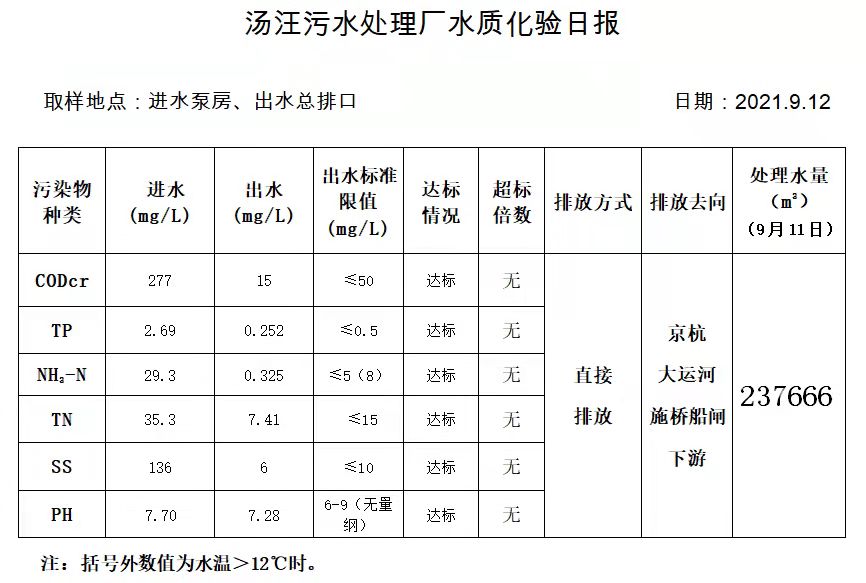 汤汪污水处理厂水质化验日报(2021.9.12)