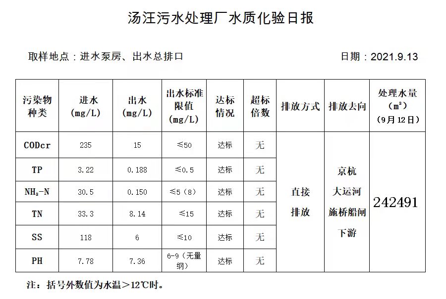 汤汪污水处理厂水质化验日报(2021.9.13)