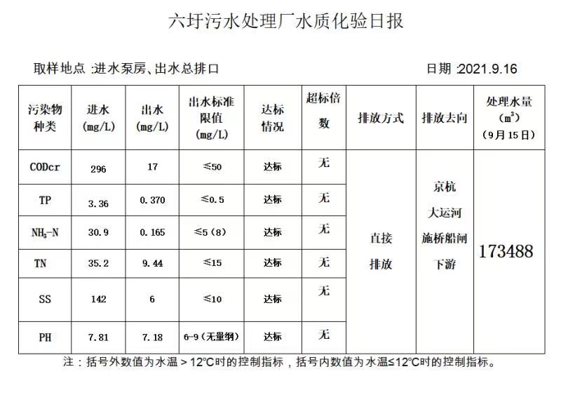 六圩污水处理厂水质化验日报(2021.9.16)