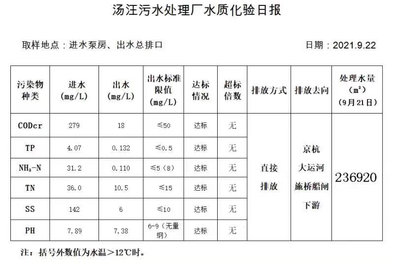 汤汪污水处理厂水质化验日报(2021.9.22)