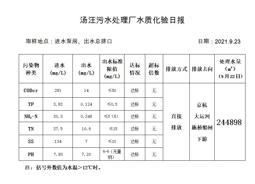 汤汪污水处理厂水质化验日报(2021.9.23)