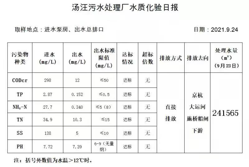 汤汪污水处理厂水质化验日报(2021.9.24)