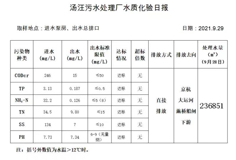汤汪污水处理厂水质化验日报(2021.9.29)