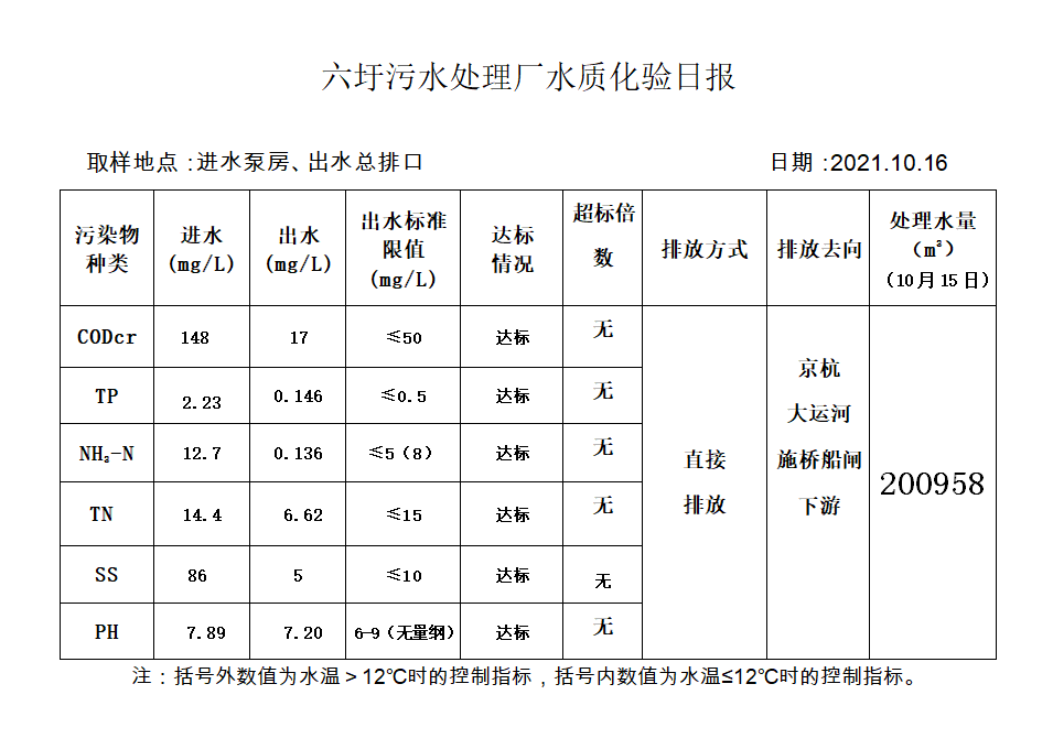六圩污水处理厂水质化验日报(2021.10.16)
