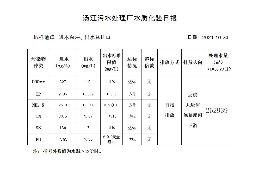 汤汪污水处理厂水质化验日报(2021.10.24)