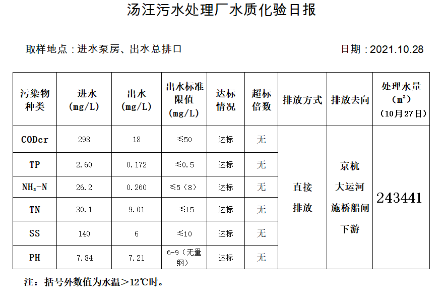 汤汪污水处理厂水质化验日报(2021.10.28)