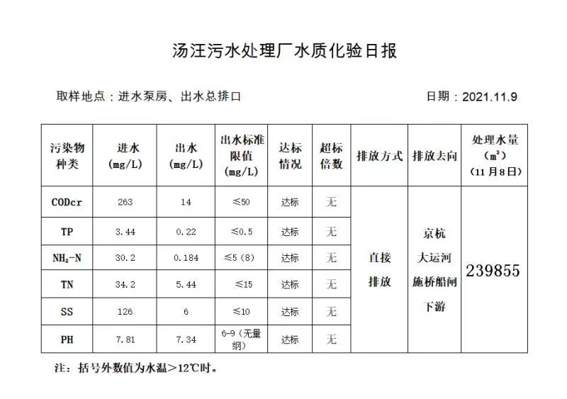 汤汪污水处理厂水质化验日报(2021.11.9)
