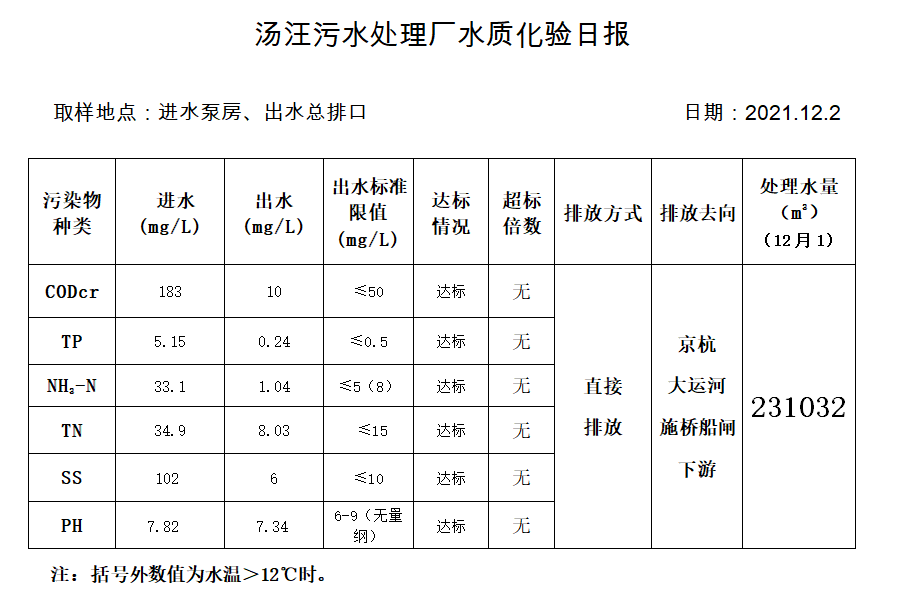 汤汪污水处理厂水质化验日报(2021.12.2)