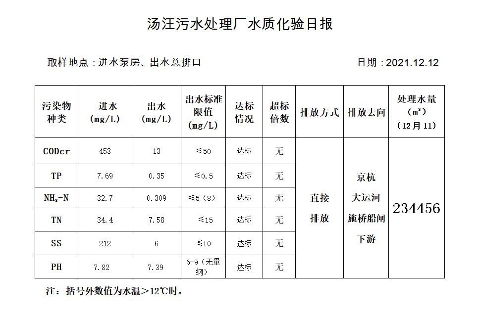 汤汪污水处理厂水质化验日报(2021.12.12)