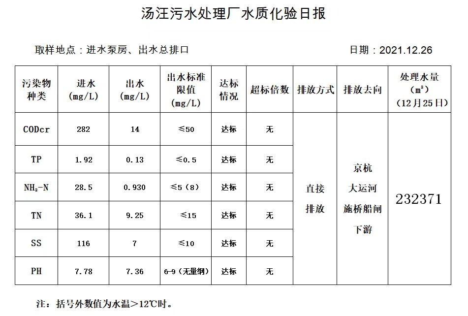 汤汪污水处理厂水质化验日报(2021.12.26)